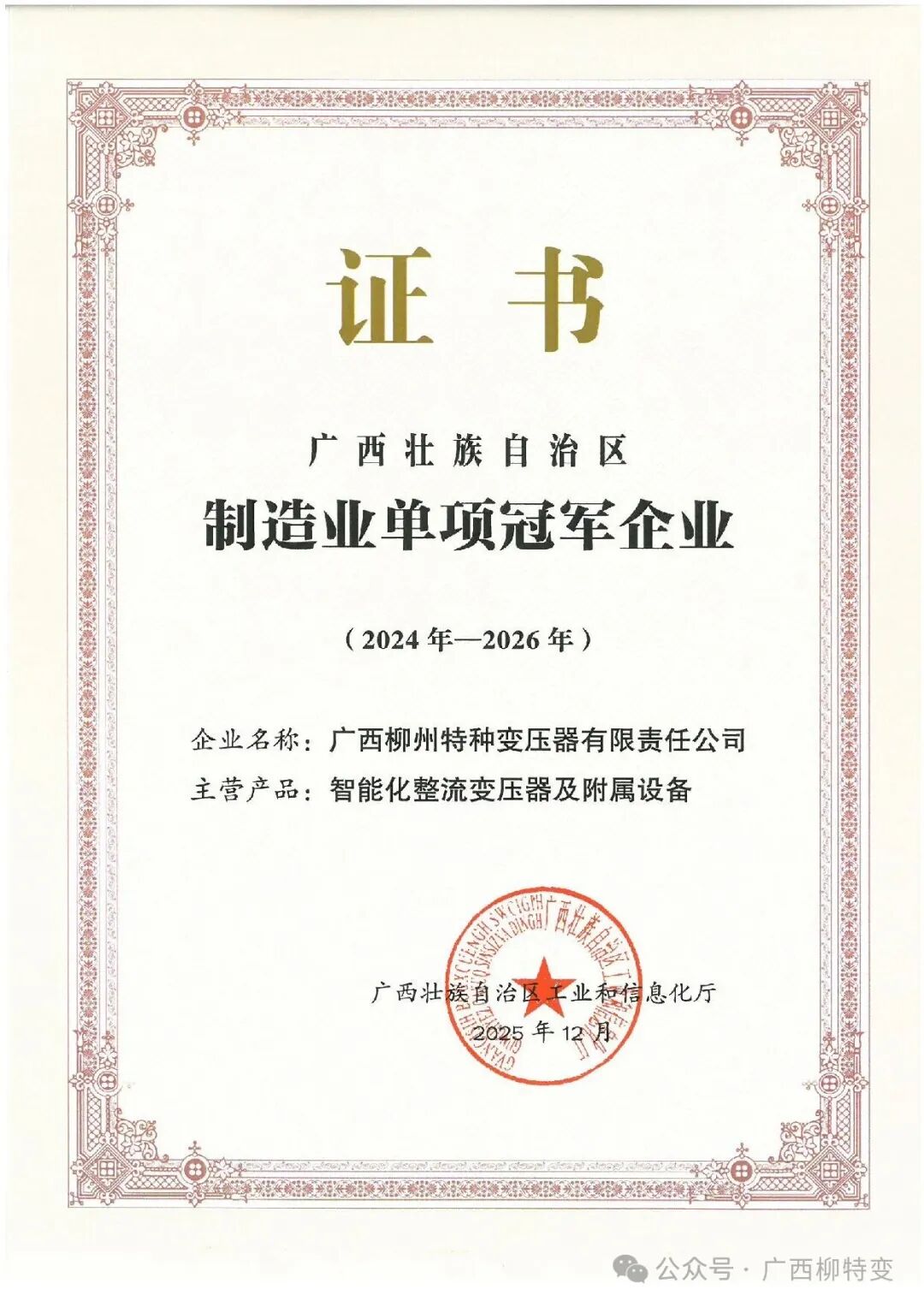 近日,广西壮族自治区工业和信息化厅正式公布2024—2026年度制造业单项冠军企业名单,柳特变凭借主营产品“智能化整流变压器及附属设备”,成功获评此项殊荣,标志着公司在电力智能化高端装备领域的技术领先性与市场影响力获得了专业认可。在全球智能化大背景下,依托于强大的设计研发能力,公司自主研发及制造的智能化整流变压器及附属设备成为行业内降低成本和提高效率的典范,在多个项目的现场运用书写智能节能“传奇”,从传统工业的转型升级到新兴产业的蓬勃发展,皆留下战绩。公司产品以可靠的性能和智能化的管理,助力客户实现生产流程优化和能源成本控制,为企业在全球市场竞争中赢得先机。